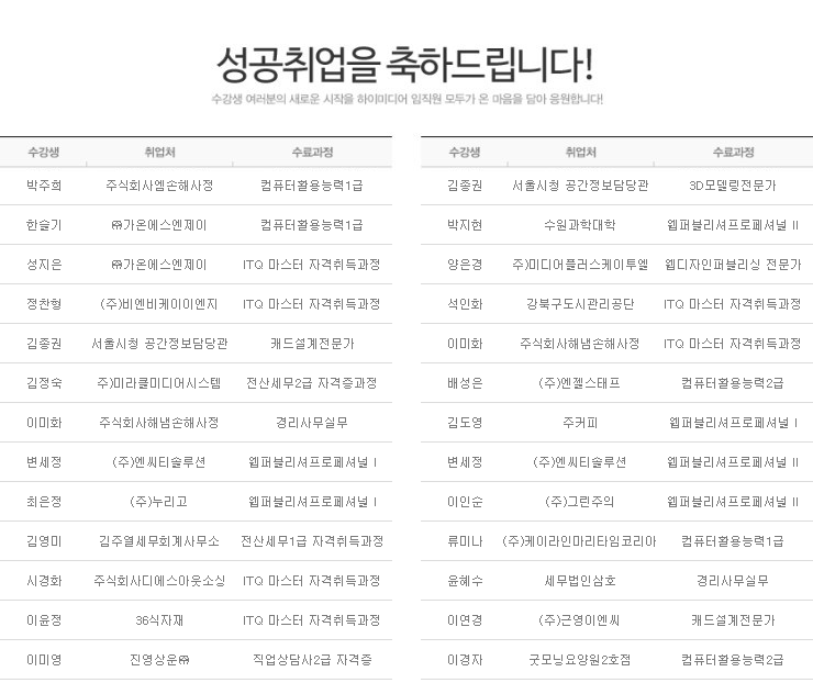 하이미디어컴퓨터학원 노원캠퍼스 2015년 4월 성공취업자 명단입니다.