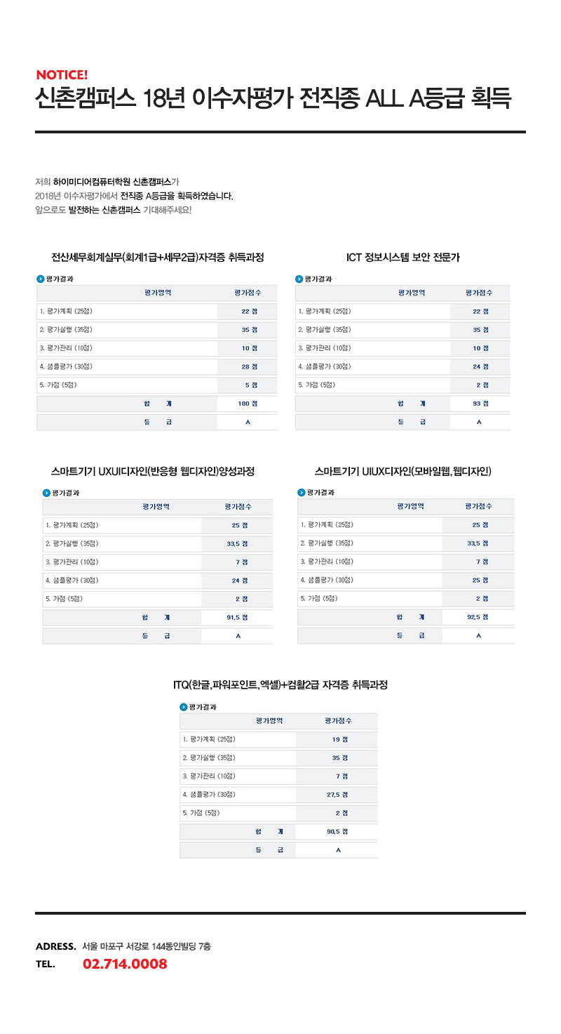 신촌캠퍼스 18년 이수자평가 전직종 ALL A등급 획득